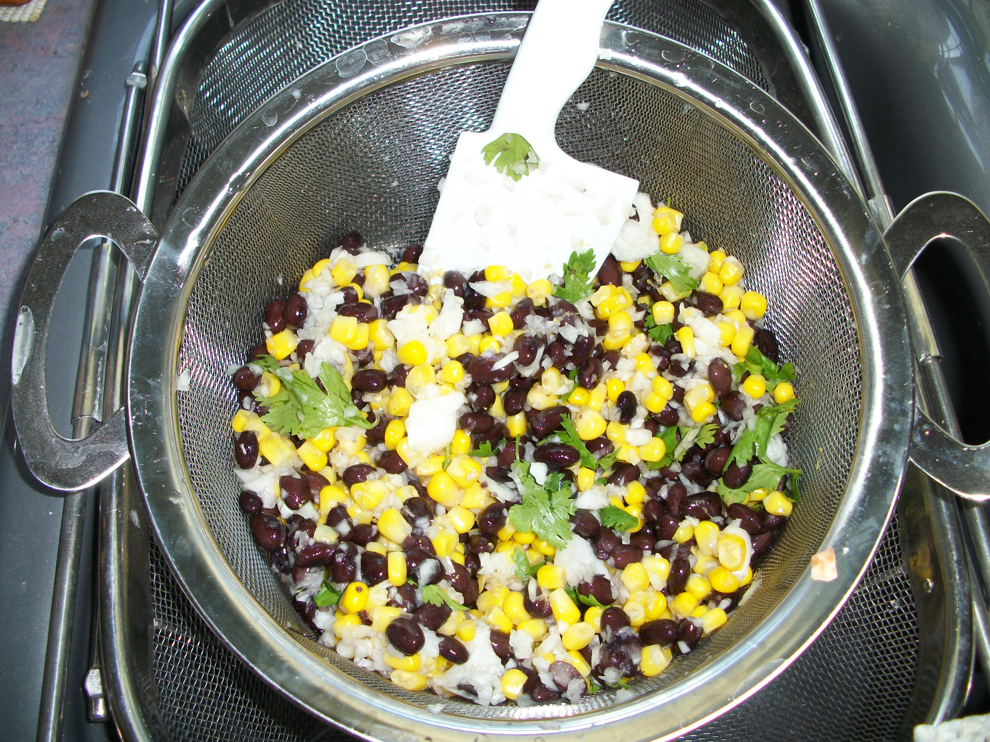 Strain and rinse canned beans and corn. Add chopped onion and fresh cilantro.