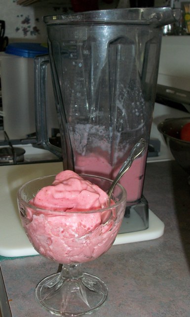 Today I made strawberry ice cream (or perhaps I should call it ice milk) my way. It’s so easy with the Vita-mix. Here’s how: