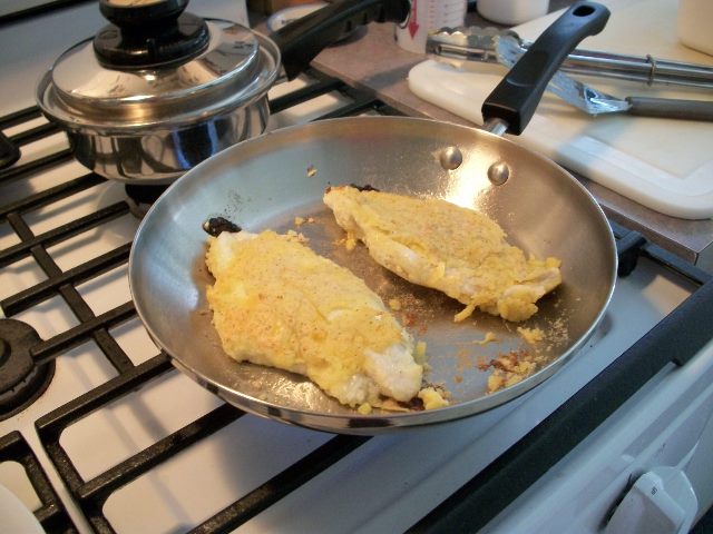 • Place each fillet in the skillet and cook for approximately 5 minutes. Turn. If fish sticks to pan, wait at least another minute to turn.