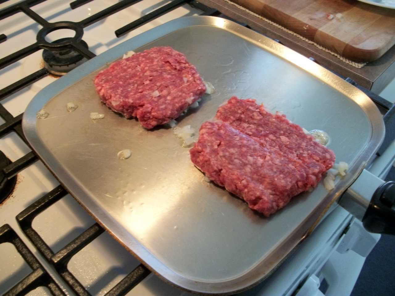 5. Carefully place each patty, onion side down, on the preheated griddle. Salt and pepper the second side of each patty.