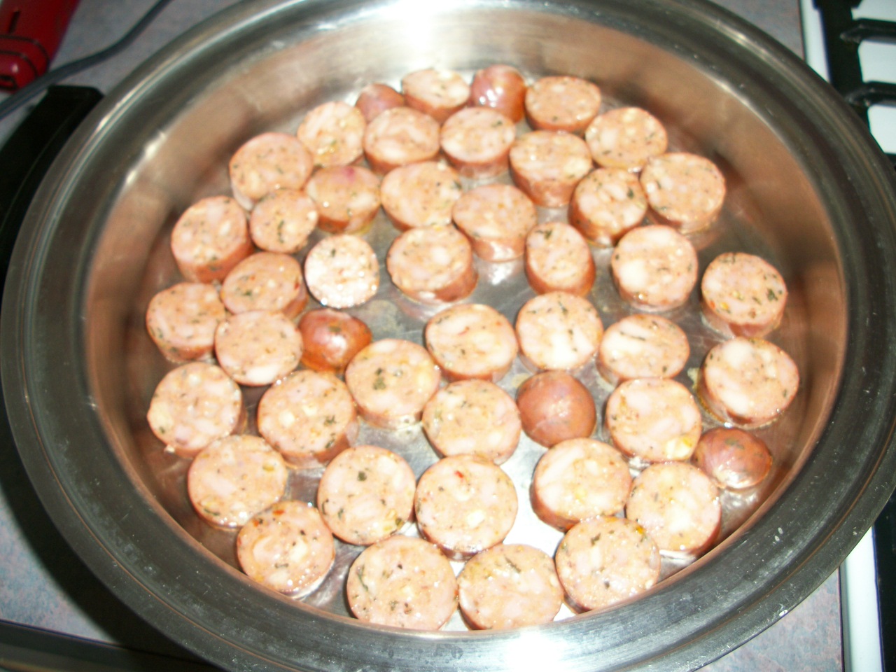 4. Cover bottom of skillet with sliced sausage. Layer farfalle pasta on top the sausage. Then pour the sauce over the layers, completely covering the pasta.