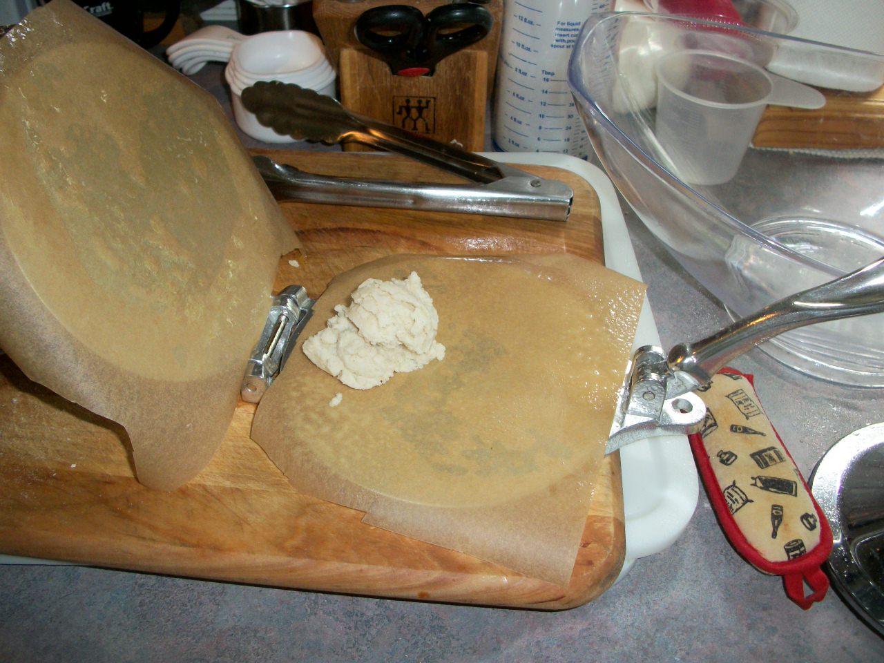 Lesson Three: Position the ball of dough off-center, away from the handle. Press should work easily. Do not force. The dough spreads thinly and makes a delicate tortilla. Handle gently.