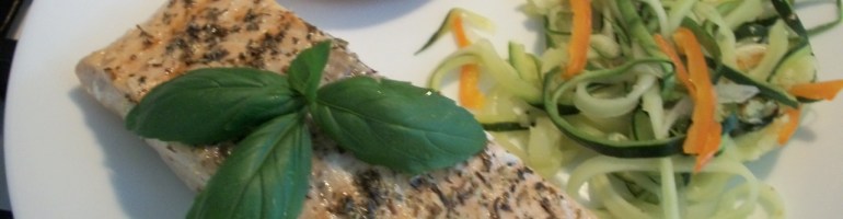 - Plate the salmon beside the “noodles.” Garnish with a sprig of fresh basil if desired. Serve immediately with your choice of roll and beverage.