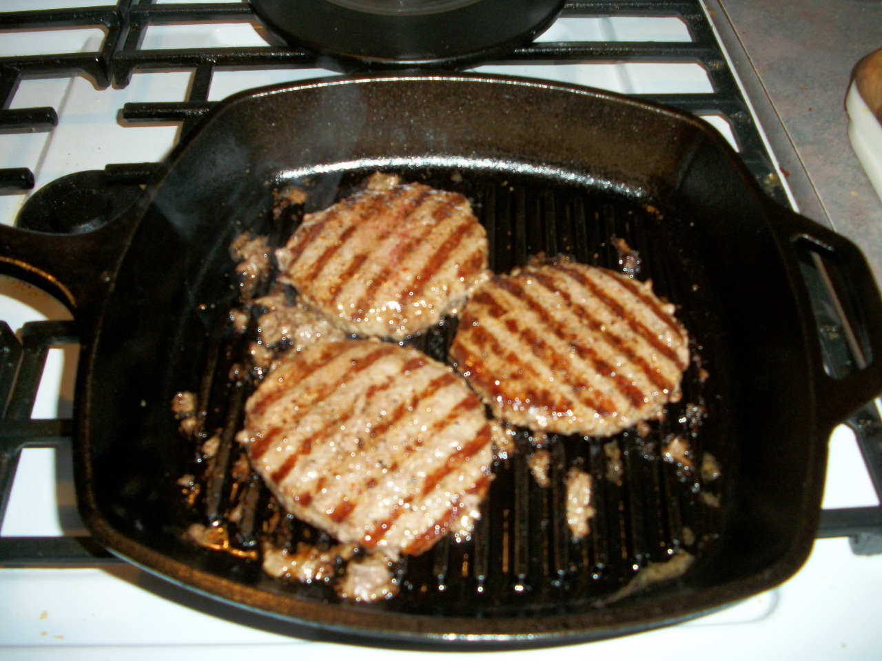 Grill burgers over medium heat for 6 minutes, turn, and cook 5 more minutes. A cast iron grill pan gives patties grill marks and drains away fat.