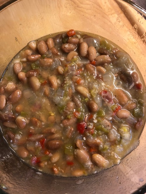 We often eat beans. We like them, they’re good for us, and they are inexpensive. Today’s pintos (made in my Instant Pot) are made zesty with the addition of hot Hatch Chilies.