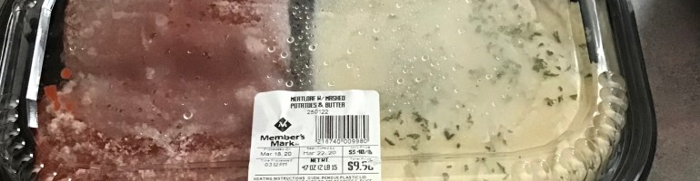 I knew this meal would come in handy. It’s from Sam’s Club, a Members Mark Meatloaf and Mashed Potatoes meal I had tucked away in the freezer. Although it serves two, we aren’t big eaters and this makes 4 servings for us. I will use the Reheat setting on my air fryer oven for half the (thawed) package, refrigerating the remaining half.