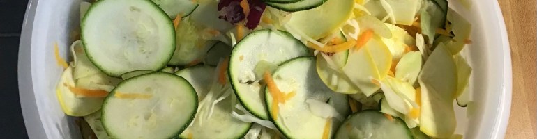 This time of year, fresh produce is abundant. Visit your local market or produce stand and pick up a variety of squashes, cucumber, cabbage (red and green), carrots, celery, and onion. These vegetables are low in calories, high in nutrients, and filling.
