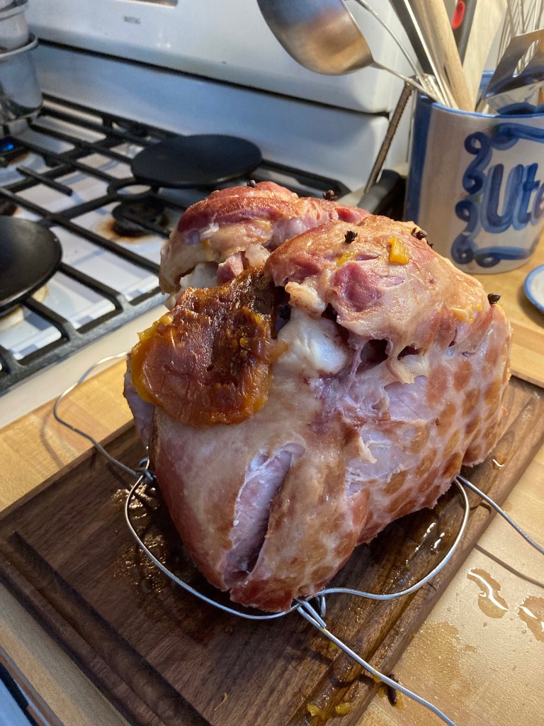 I borrowed a trivet from my Instant Pot 6 quart, added two cups water, and placed the ham on the trivet. That’s all that’s necessary, but I wanted to jazz it up a bit since, you know, it’s New Year’s Eve and I feel festive. So I inserted a few whole cloves and added some dried mango for a bit of sweetness to complement the savory pork. Any fruit works, especially pineapple and dried apples. Use what’s convenient for you.