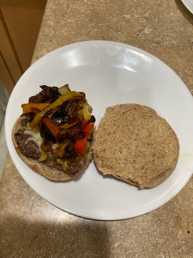 In the same skillet, sauté julienned peppers and onions for topping the burgers. Cheese is optional. Top with chopped cilantro (also optional) and serve on a toasted bun.