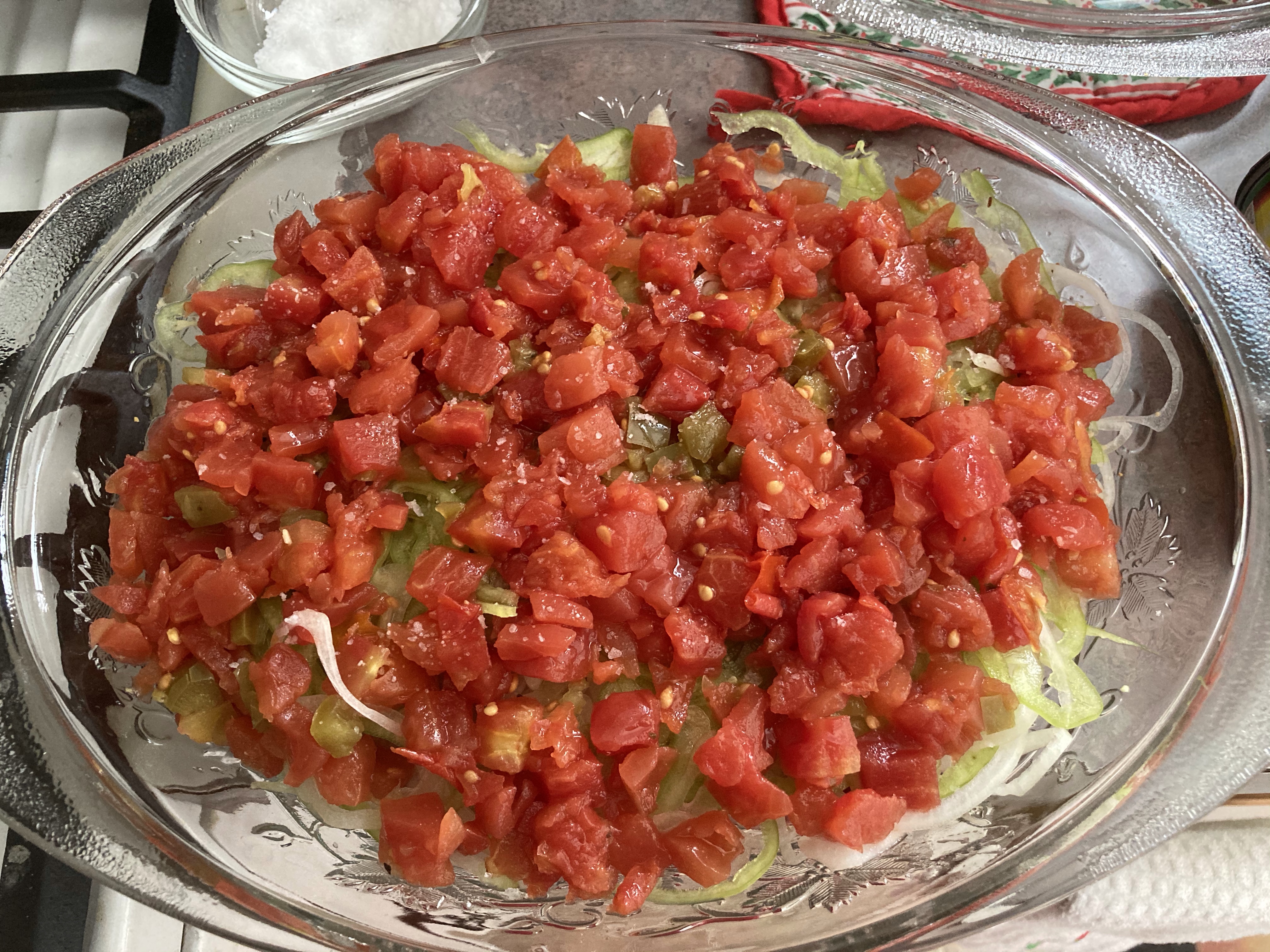 - Layer peppers and onions atop the meat. Salt and pepper.